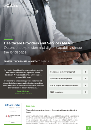 The M&A market for Healthcare Providers and Services continues to show strong transaction activity. Structural trends such as the shift toward outpatient care, the scaling of provider platforms, and succession planning are key drivers shaping the deal landscape both in Switzerland and internationally.