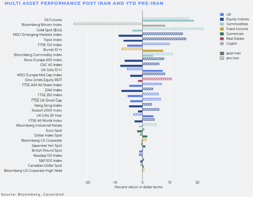 The broader market moves are also reflective of this perceived higher oil-price/interest rate environment. Cyclicality/value has effectively been sold as the market takes refuge in quality/growth. The reverse of what we have seen year to date. The clearest example of this is the relative outperformance of the NASDAQ as mega-cap tech is seen as resilient to higher rates rather than exposed to AI capex risk. The reversal of the year’s winners and losers is very clear across asset classes as can be seen on the chart below. Anything that performed badly at the start of the year has recovered and vice versa.