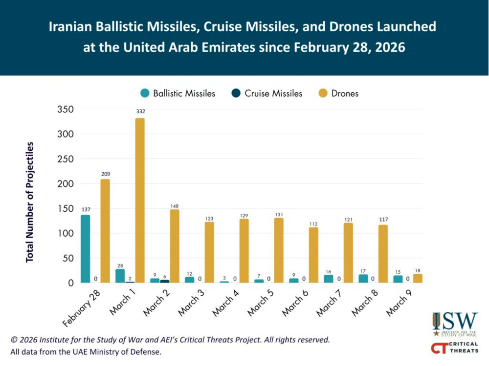 Or perhaps more positively when the US/Israel coalition has degraded Iran’s ability to launch missiles and drones. There is clear evidence to suggest the tempo of Iranian missile strikes has started to subside, the US command talk about a decline of 90% which is a result of US-Israeli strikes on missile launchers (or Iran is conserving their remaining missiles for later in the conflict.) Drone strikes are also falling in their frequency so maybe there is some evidence that the attritional offensive strategy is starting to work. This can be seen in the data published for instance by the Government of the UAE below.