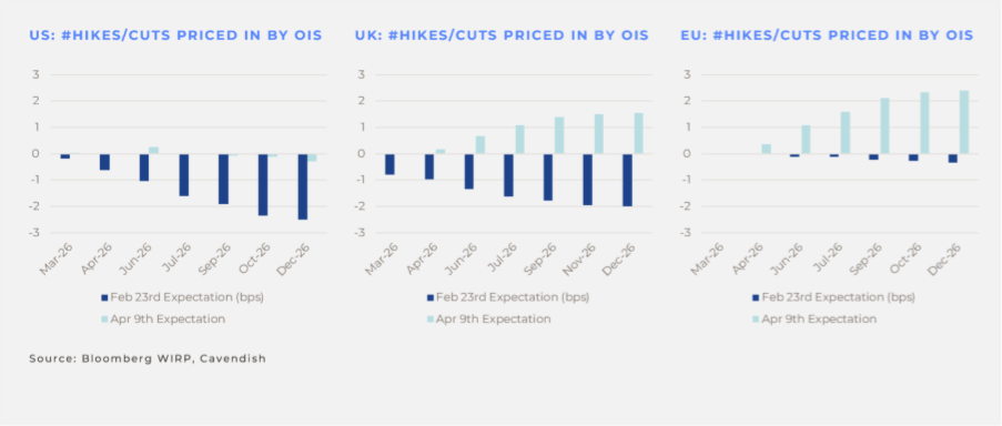Broadly speaking the US is now expecting flat rates rather than 50bp cuts pre-conflict. The Eurozone is expecting 50bp of hikes rather than maybe a cut. And perhaps most dramatic, the UK has gone from expecting 1-2 cuts to 1-2 hikes since the conflict. To be fair again, those rate hikes are off their wides, where the UK for instance was expected at one point to hike by as much as 100bp. But nevertheless, and critically, there has been a complete volte-face of rate expectations in the developed world.