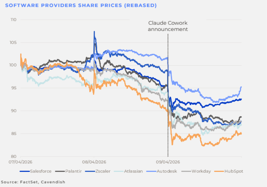 You may recall the large sell-off in the major software stocks in February, as markets went hunting for the ‘losers’ of the AI revolution. Dubbed (at least by my young colleague Ioan) “software-mageddon”; the AI fear-driven rout saw the S&P software and services index fall nearly 13% over six successive trading sessions in February, wiping out around $1 trillion of market value.
