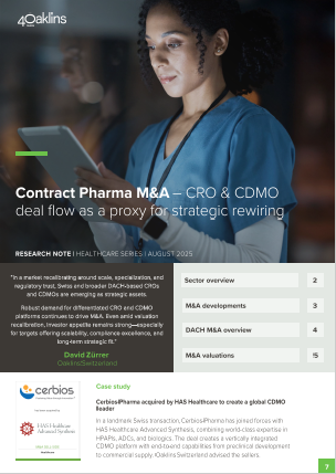 The H1 2025 edition of our Healthcare Series focuses on the Contract Pharma sector. CRO and CDMO transactions serve as a barometer for strategic repositioning in a market increasingly shaped by specialization, scale, and regulatory trust. The report provides in-depth insights into global trends, DACH-specific developments, and valuation dynamics — highlighting how investors and strategists can seize opportunities in the current environment.