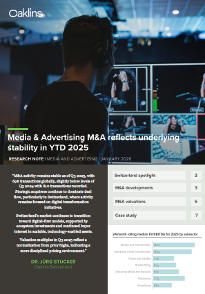 The latest Oaklins Media & Advertising M&A report highlights a Swiss market that remains stable amid an ongoing shift toward digital first business models. While expected market growth in Switzerland remains moderate at around 1.5% per year, sustained momentum in digital advertising, ad-tech, and immersive content is supporting consistent M&A activity. Strategic initiatives by leading Swiss media groups to develop a shared, privacy-compliant digital advertising ecosystem further reinforce the sector’s long-term structural transformation.