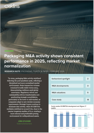 The latest Oaklins Packaging, Plastic & Paper M&A report highlights a Swiss and global packaging market that has entered a more disciplined and normalized phase following the post-pandemic peak.