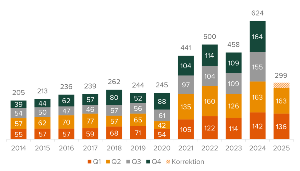 Transaktionsvolumen i Danmark i andet kvartal 2025 er en anelse lavere end det historisk høje fra
