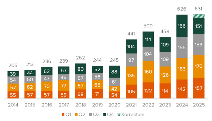 Virksomhedssalget i fjerde kvartal 2025 viser et fortsat stabilt aktivitetsniveau i Danmark og Europa, hvilket medfører, at året som helhed tangerer rekordniveauet for 2024.